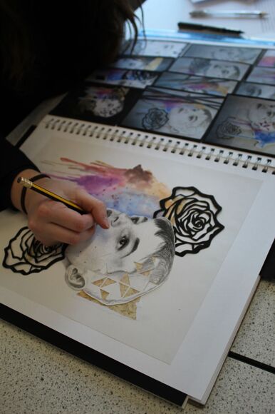 “The arts curriculum has been adapted to give students greater opportunities to experience a range of arts; students in Years 7, 8 and 9 now explore illustration, three-dimensional design, printmaking, digital media and photography alongside drawing and painting. At KS4 students are offered a range of arts GCSEs – Fine Art, Photography, Textiles, Graphics, Music, Drama and Performing Arts.